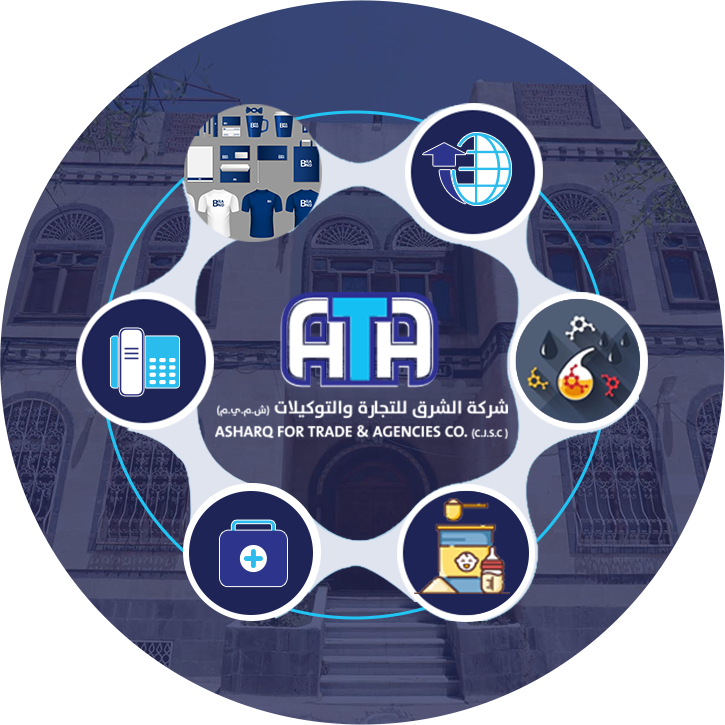 Asharq for Trade & Agencies Company (ATA) is considered as one of the most prominent and leading companies in the field of importation, marketing and distribution in Yemen. . It represents a sustainable number of Multinational companies as a sole agent and/or approved representative. Lately, the company has achieved a considerable growth, expansion and diversification of activities according to a strategic vision aimed at improving the overall performance of the company according to governance and organizational structure that achieves a competitive advantage based on a significant commitment towards the international standards, principles and professional ethics in order to ensure a maximum customer satisfaction thru meeting their expectations and needs and their organizational and living requirements. The company's business is based on essential sectors: 1- Pharma Sector (Finished Pharmaceutical Products & Food Supplements) 2-Medical Appliances Sector 3- Nutrition and Infant Milk Sector 4- Engines & Equipment’s oil Sector 5- Telecommunications Sector 6- Advertising Sector 7- Logistics Services.